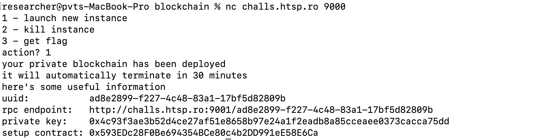 Once we have solved it, we just need to connect to the challenge server, submit our uuid and setup contract address to get the flag.